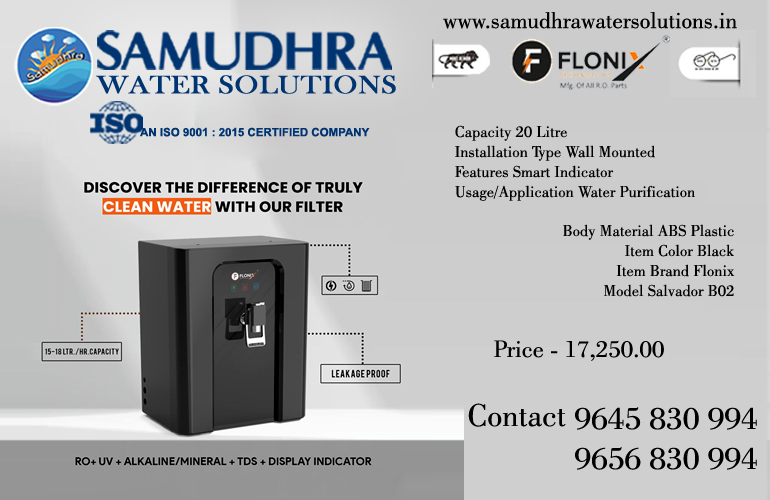 FLONIX DOMESTIC SALVADORE SYSTEM Flonix Salvadore RO water purifier with RO+MINERAL/ALKLINE+TDS Control. This state of the art purifier ensures that you are getting pure water every time. This purifier retains essential natural minerals in the purified water using an inbuilt TDS Controller. Applications : Suitable for purification of Brackish/Tap/Municipal Corporation Water Applications